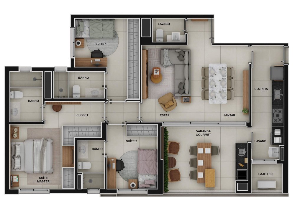 Apartamento na configuração de planta com; 3 Suítes, cozinha fechada, Varanda nivelada e face sombra.